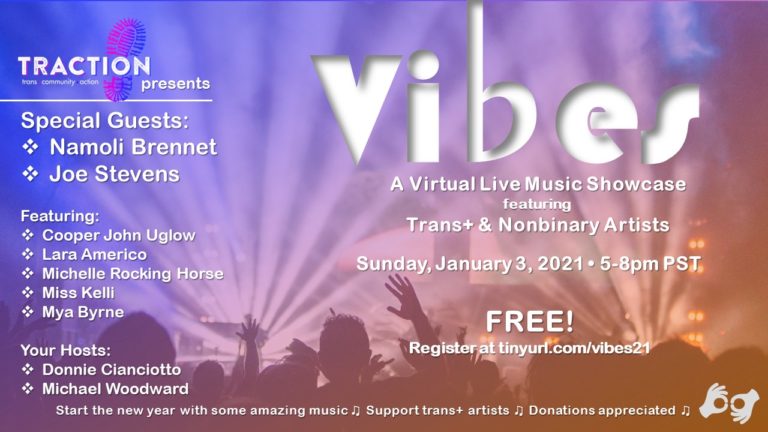 We are also here to bring folks together in celebration of our beautiful and authentic selves as trans and gender-diverse people, and to create a sense of belonging and joy. Through Project Open Arms, we help trans folks leave restrictive and oppressive areas and resettle in more supportive environments. Since 2020, our Community Campfire and Emerge! virtual series, and the Vibes music showcases, have featured the words, wisdom, and performance art of our diverse and talented community.