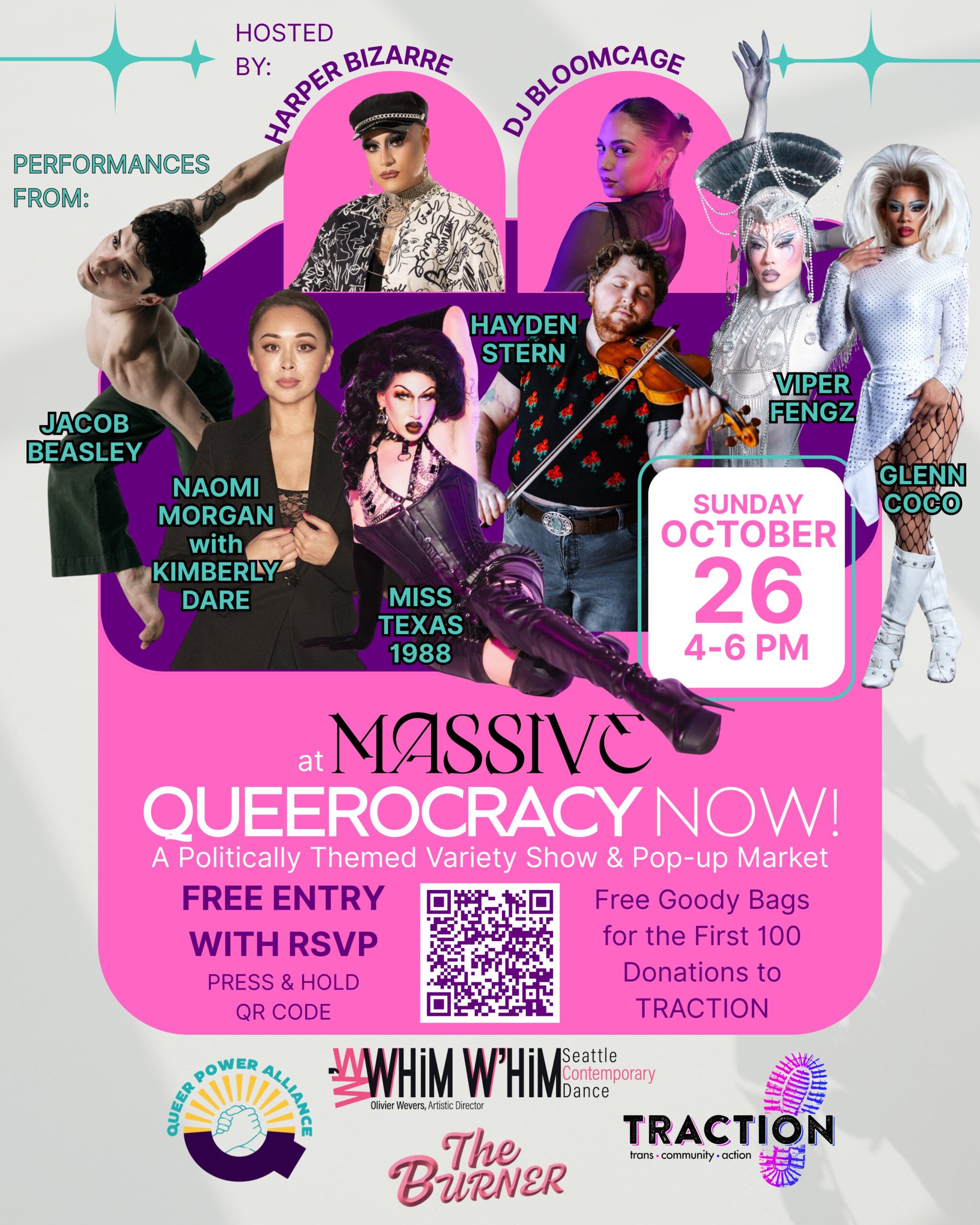 Join us for Queerocracy Now!, a variety showcase uplifting drag, music, and queer artistry in the fight for our shared future. This special edition of Queer the Vote brings together some of Seattle’s brightest performers for an evening of joy, creativity, and community power.