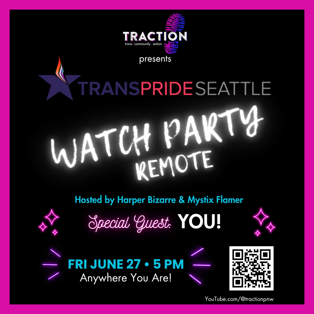 TRACTION is bringing the Trans Pride Seattle live stream to you this year. You’ll see stage performances along with roving cameras and chats with the crowd, all hosted by Harper Bizarre and Mystix Flamer.