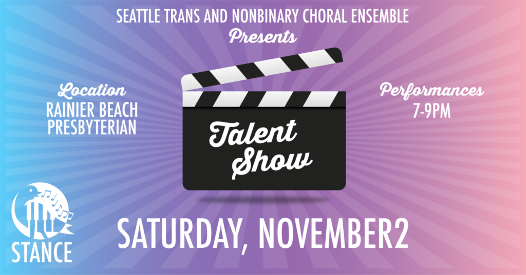 The STANCE (Seattle Trans and Nonbinary Choral Ensemble) singers are proud to present our Fall Talent Showcase on Saturday, November 2 at Rainier Beach Presbyterian. Doors open at 6:30, Performances at 7:00.