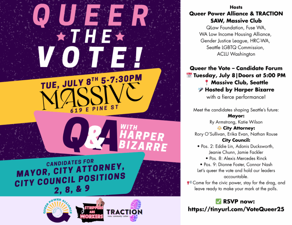 Queer the Vote! Candidate Forum 🗳️ Queer the Vote – Candidate Forum 📅 Tuesday, July 8 | Doors at 5:00 PM 📍 Massive Club, Seattle 🎤 Hosted by Harper Bizarre