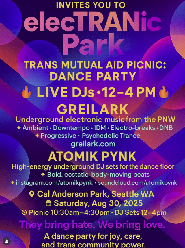 Cal Anderson Park 1635 11th Ave, Seattle, WA, United StatesTrans Mutual Aid Picnic Last time christofascists were in town, it was a sh%! show. This time, there is a plan. Join us for a Trans Mutual Aid Picnic in Cal Anderson 8/30 from 10:30am to 4:30pm. We’re inviting everyone who can come with love in their hearts for trans people to come to the […]